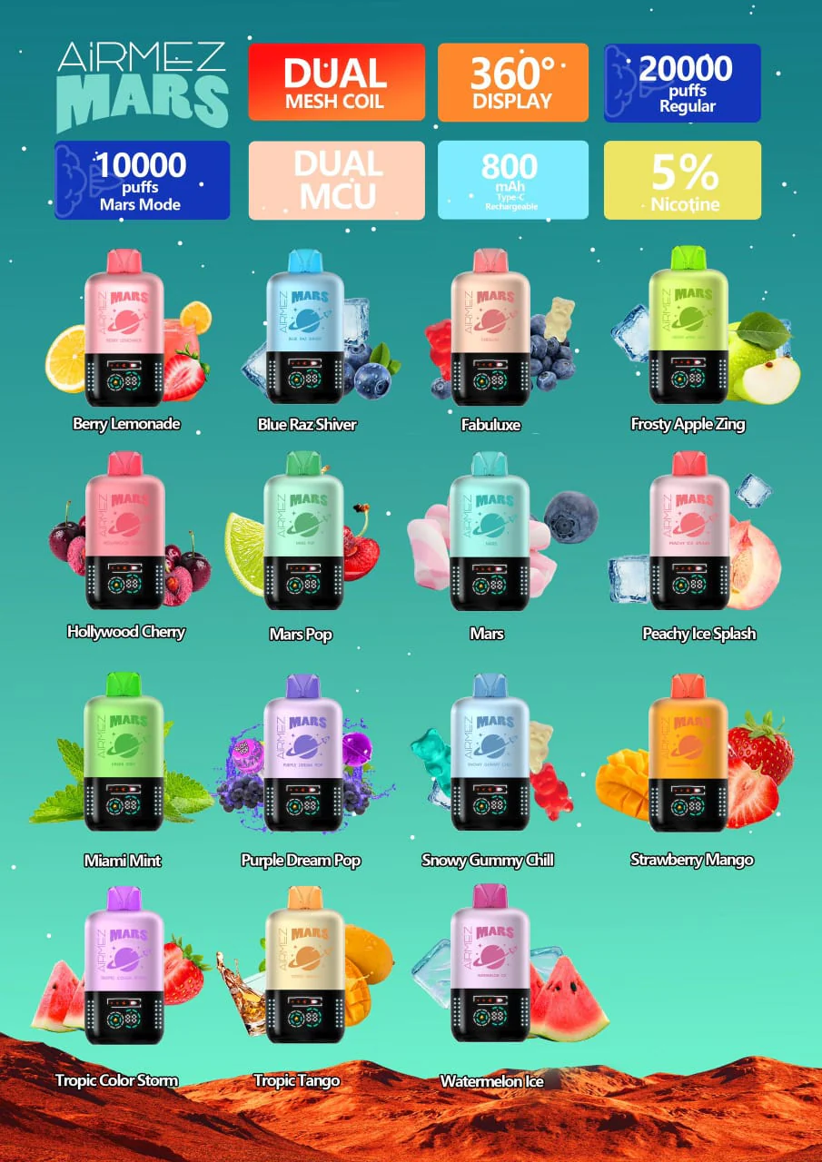 Airmez MARS 20K – jednorázová e-cigareta s 20 000 ťahmi a bohatými príchutiami. 6ml e‑liquidu, 400mAh batéria s Type‑C nabíjaním. Premium vaping na Slovensku s rýchlou slovenskou dodaciou. Objednávajte ešte dnes!